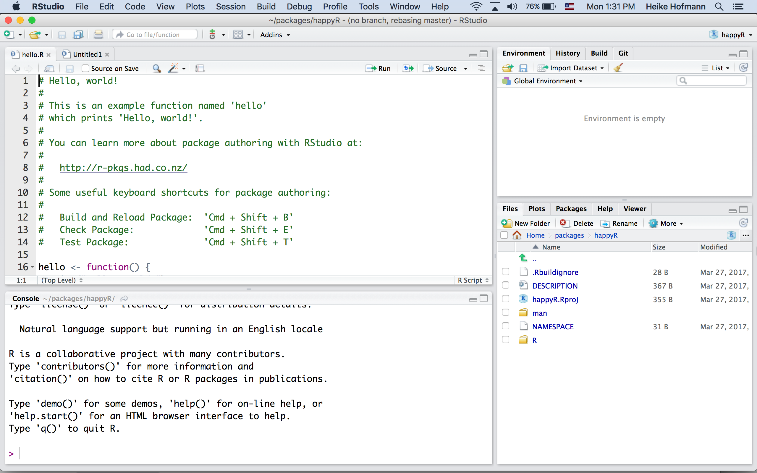 Build the package (CMD + shift + B) and run the function hello()
